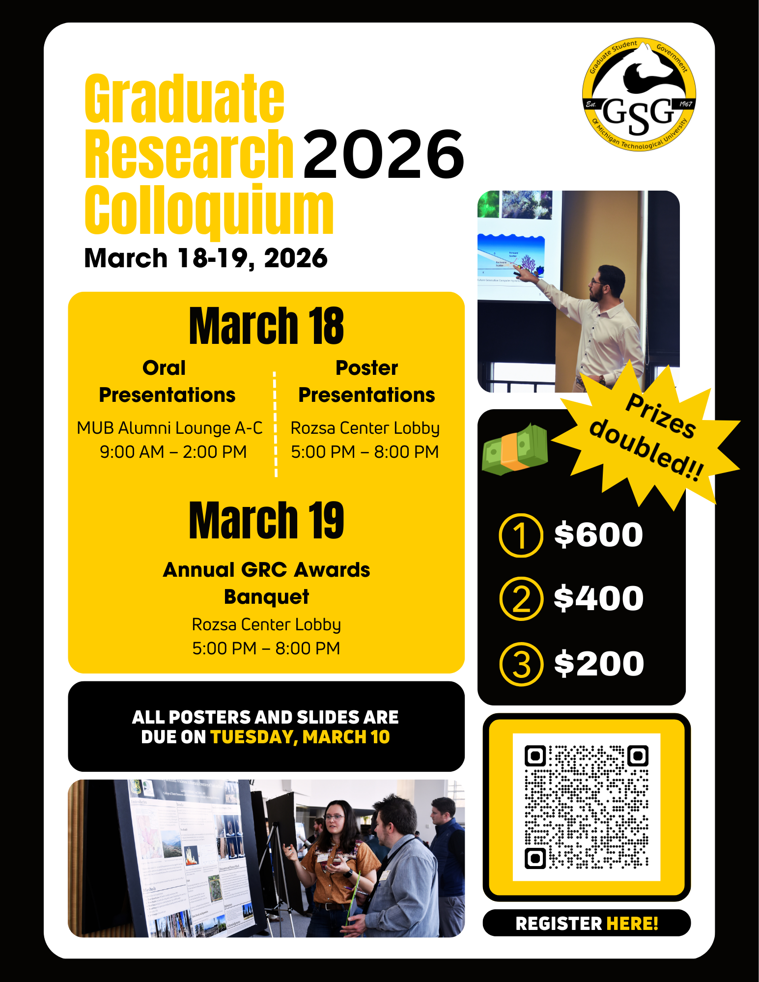 The GRC event will culminate with the annual GRC Awards Banquet. All participants and judges are invited to attend. The banquet will be held on Wednesday, March 26 at the Rozsa Lobby, 5-8 pm. Please reach out with any questions about the event to this contact: gsg-research@mtu.edu.